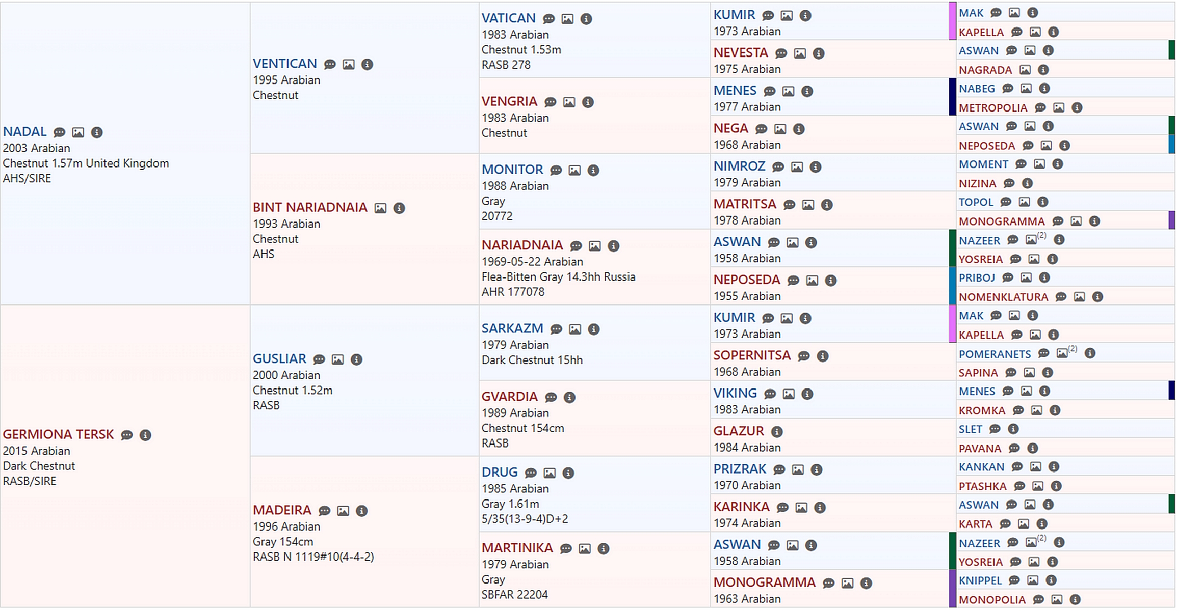 Que dire de cette superbe petite merveille alezane foncée ? Qu'elle est vraiment un trésor génétique, traçant à partir des lignées du père et de la mère sur Mammona et ses meilleurs descendantes : Metropolia, Neposeda, Monogramma,... ? Le fait qu'elle soit la petite-fille de l'une des meilleures juments de course et productrice de GR