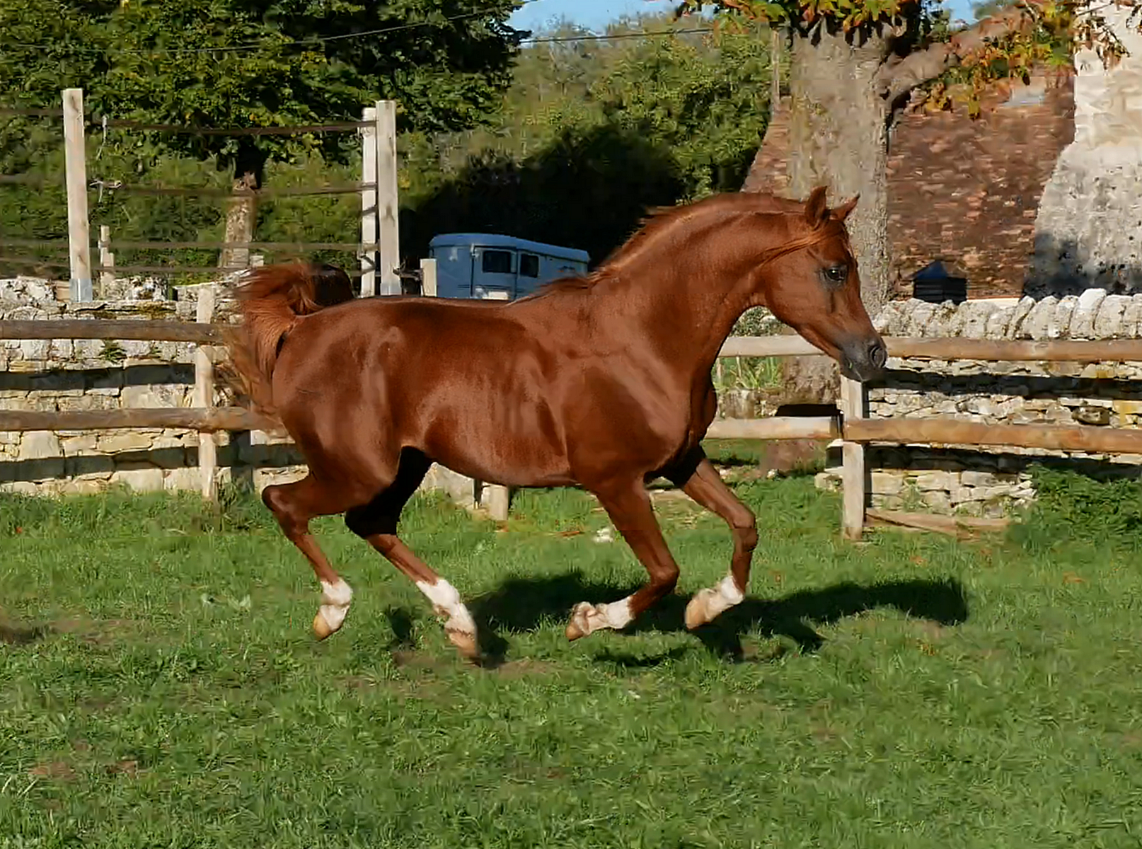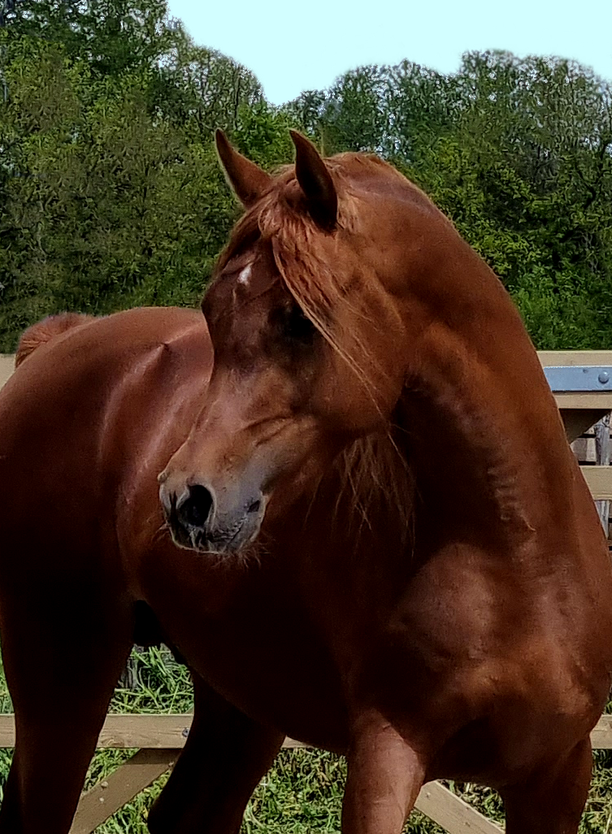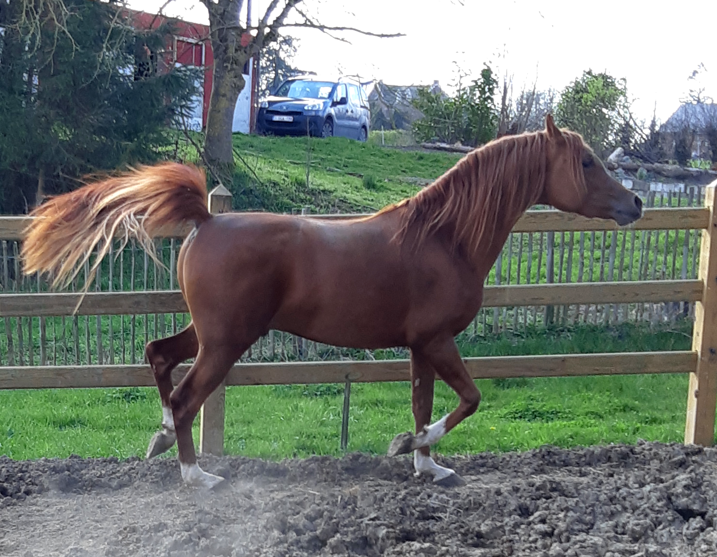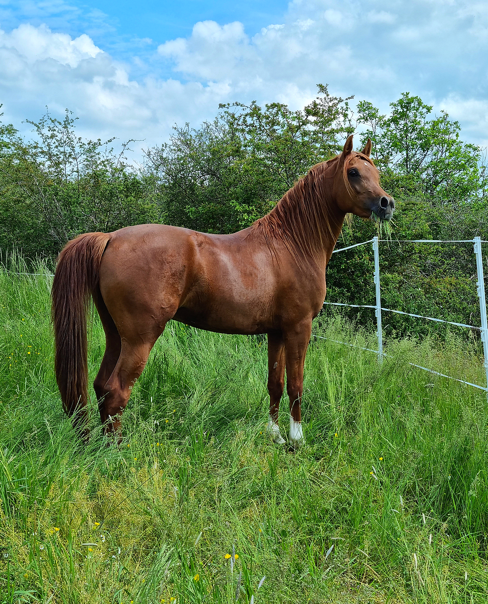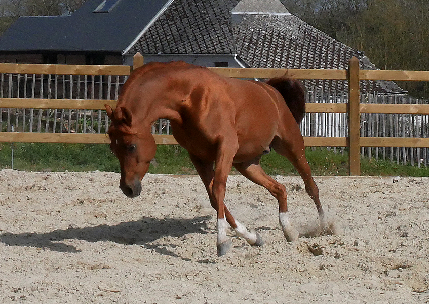By Kosmonaut, senior champion in show, race horse performer who was used as an improver by the Trakehner stud-book. Kosmonaut is the full sibling to the Holland national champion Karnaval, sire, between many other ones, of Valujevka, one of the best race mare in Russia, winner of the 2011 WAHO Trophy and dam of 14 excellent racehorses, used with great success in breeding too. The dam of Kosmonaut is the legendary Karinka 2/21 (8-8-2-1-2),, the dam of Drug, Dre***, 5/35 (13-9-4), European show champion and winner of three prestigious stake races : the Russian Derby, the Coupe d’Europe in Evry and the Al Nayan International at Kempton Park in England. Drug is the sire of our former broodmare Pokupka, of the endurance horse producer Karesi DRE*** and of numerous wonderful race and show horses.