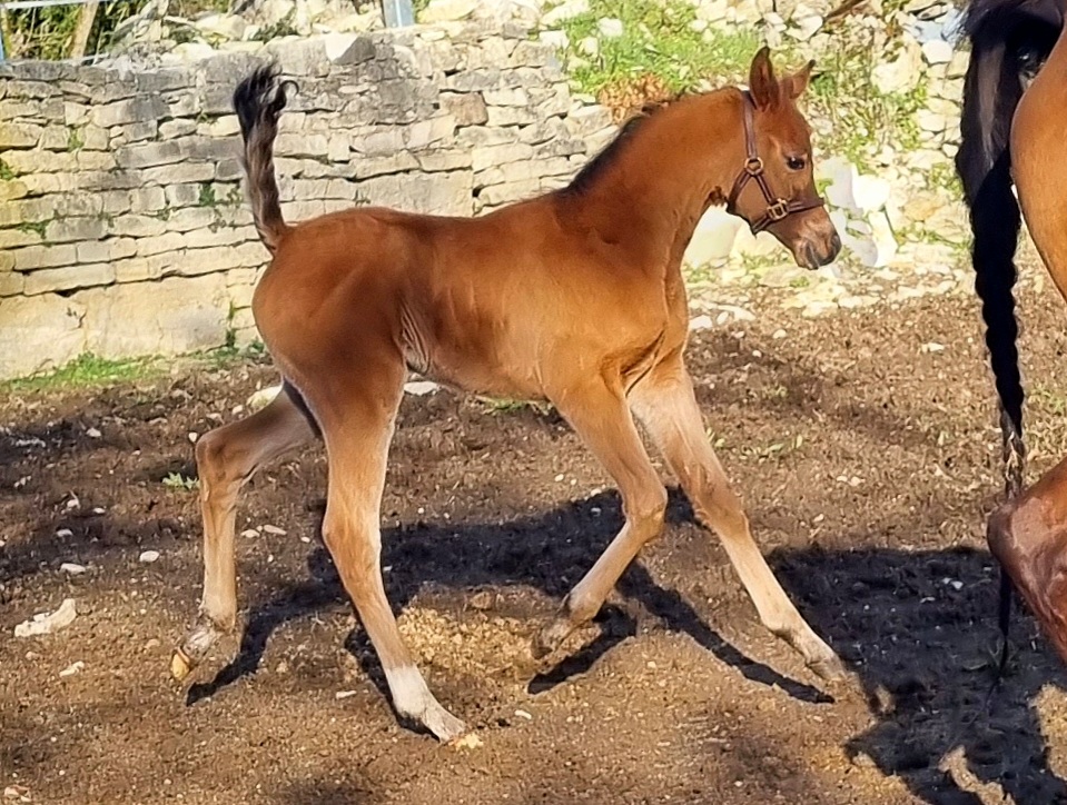 Par Mir Khan, étalon licencié médaille d'or, Ster, plusieurs fois Champion National et 1ère place en International, 2ème lors de la Coupe des Nations, cheval de haut niveau Wels, lui-même par Mirok Monpelou, Champion d'Europe, par Vatican.