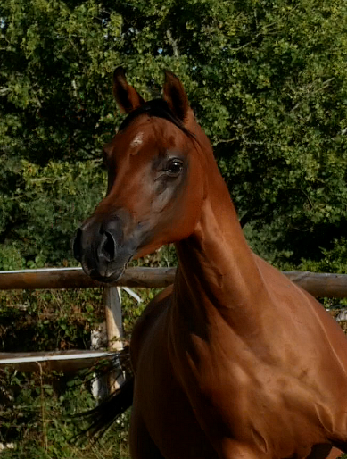 La très belle Maïa est une jument courte et compacte, avec une très jolie tête au front large, de beaux yeux, un ensemble dos, rein et croupe très bien attaché. La croupe est longue et plate avec un bassin bien oblique et une attache de queue haute. On remarque aussi une belle profondeur de poitrine et beaucoup de charisme typique de la race Arabe.